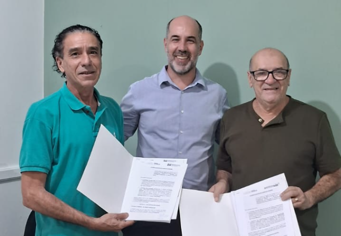 Lucyano Ribeiro, Igor Pontini e Mario Castro comemoram assinatura de acordo coletivo