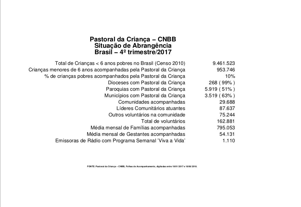 No fim de 2017 o número de crianças menores de 6 anos atendidas pela pastoral da criança chegava a 953.754 numero aparentemente grande, mas se levarmos em consideração as crianças que vivem em situação de pobreza no brasil esse número enorme equivale a apenas 10% segundo o gráfico abaixo: