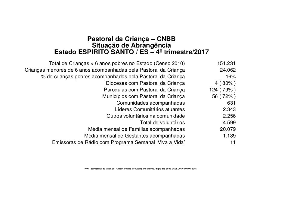 Aqui no espirito santo a realidade é um pouco melhor, porém não tão diferente, do número de crianças em situação de pobreza no estado, de acordo com o censo de 2010, apenas 16% são acompanhadas pela pastoral da criança. Como podemos ver no gráfico abaixo: